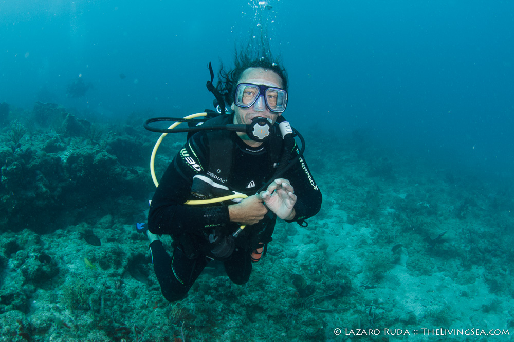 So you see… Even after countless decades scuba diving, even the same spot, you can always expect the unexpected. I know scuba diving in Palm Beach is known for drift diving, but the truth is that it’s not difficult to hover near the bottom without going too far. Look for the unexpected, sometimes right under your nose (like a magical little grass squid), or sometimes hovering right over your head ready to scare you half to death!