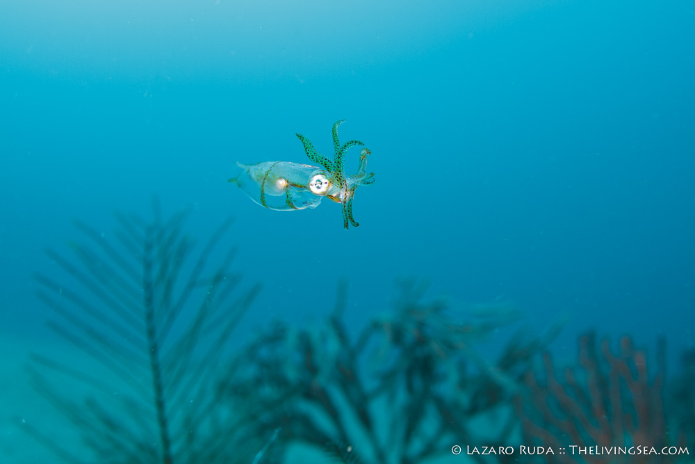 Minutes past… and past… Keeping myself occupied, I started to swim the outskirts of the reef ledge. I have a saying when it comes to nature photography: “Nature photography is all about waiting… and waiting… and waiting. When you’re done waiting… You wait a little longer. That’s when you realize all the cool stuff is happening behind you!” Sure enough, behind the camera I could see yellowhead jawfish darting in and out of their burrows, sailfin blennies displaying, and hovering beside me was a little speck of pure underwater bliss. A tiny, one inch, grass squid. This beautiful and delicate little creature was completely unafraid of me as it hovered 5 inches from my face mask, even while I exhaled.
