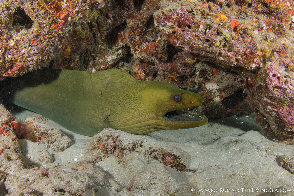 The camera was all setup and I had already dedicated over 20 minutes to getting the garden eel photograph, so I simply enjoyed observing this delicate little grass squid for the time being. Suddenly, out of nowhere, a large shadow darted in, inches from my mask, at high speed at the edge of my periphery. To say I was startled was an understatement! A large shark sucker (a.k.a. remora) was the culprit of my distress. As soon as my mind made out what it was, my neck twisted like an owl, as I looked around for this shark sucker’s host. Numerous divers have been seeing a tiger shark hanging out in the area and having a tiger sneak up on me is not my idea of fun. Unexpected dive encounter number one for the day complete… Slash a year off my lifespan for the scare!